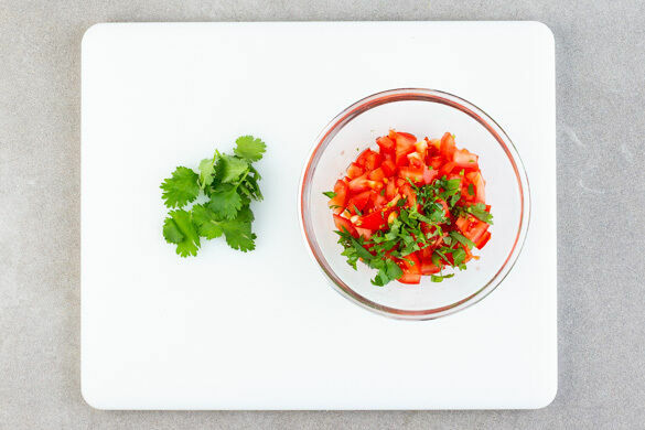 Die Tomaten in kleine Würfel schneiden. Einige Korianderblätter für die Garnitur aufbewahren, den restlichen Koriander samt Stängeln fein schneiden und mit den Tomaten vermengen. Aus 1EL Olivenöl, 1–2EL Limettensaft sowie je 1 Prise Zucker, Salz und Pfeffer ein Dressing anrühren und kurz vor dem Servieren mit den Tomaten mischen.