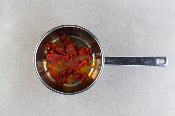 Den Backofen auf 240°C (220°C Umluft) vorheizen. Das Tomatenmark mit 2TL Gewürzmischung und 2EL Mehl in einem mittelgroßen Topf mit 1EL Pflanzenöl verrühren und bei mittlerer Hitze ca. 1Min. anbraten.