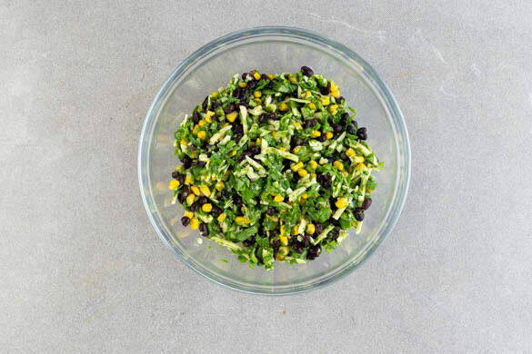 Die Bohnen mit den weißen Lauchzwiebeln, dem Spinat, der Paprika, der Chilischote nach Belieben, der ½ des Maises und ca. ⅔ des Käses vermengen. Die Füllung mit 1 kräftigen Prise Salz und 1 Prise Pfeffer würzen. Tipp: Wer mag, kann auch mehr Mais verwenden.