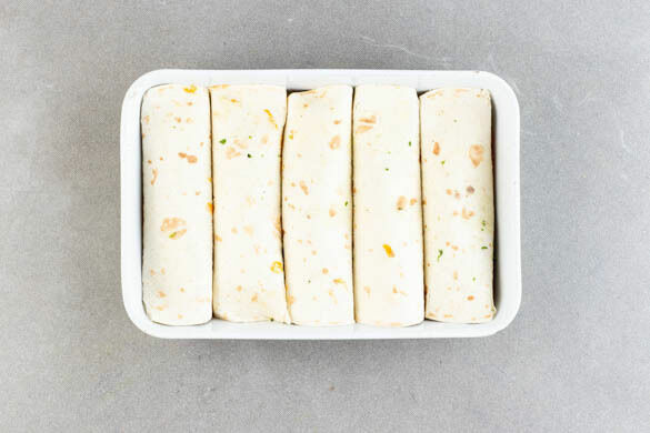Eine ausreichend große Auflaufform mit 1EL Pflanzenöl fetten und 2–3EL Sauce gleichmäßig auf dem Boden der Form verteilen. 4–5 Tortillas mit der Füllung belegen, aufrollen und mit der Naht nach unten in die Auflaufform legen.