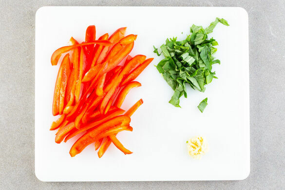 Die Paprika vierteln, entkernen und in dünne Streifen schneiden. Den Knoblauch schälen und fein würfeln oder reiben. Die Minzeblätter abzupfen und fein schneiden.