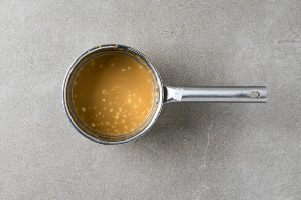 Den Knoblauch schälen und fein würfeln. Die ½ des Knoblauchs mit der Erdnussbutter und 1EL Sojasauce in einem kleinen Topf verrühren. Bei mittlerer Hitze nach und nach insgesamt 125ml heißes Wasser zugeben und alles zu einer glatten Sauce verrühren.