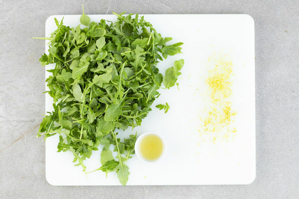 Den Rucola ggf. verlesen und harte Stängel entfernen. Die Zitronenschale abreiben, dann die Zitrone halbieren und auspressen.