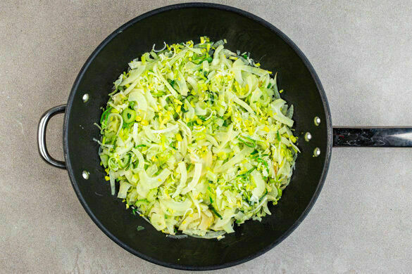 Den Lauch, den Fenchel und den Knoblauch in einer großen Pfanne mit 2EL Olivenöl und 1 kräftigen Prise Salz bei mittlerer Hitze 5–6Min. braten, bis das Gemüse weich wird, dabei gelegentlich umrühren.