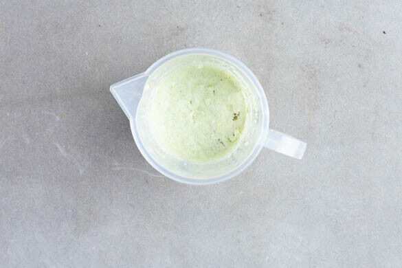 Die Minzeblätter von den Stängeln zupfen und mit dem restlichen Feta, der Knoblauch-Kräuter-Gewürzmischung und 50ml Milch in ein hohes Gefäß geben. Mit einem Stabmixer cremig pürieren, dabei ggf. mehr Milch angießen, falls die Fetacreme zu dickflüssig ist.