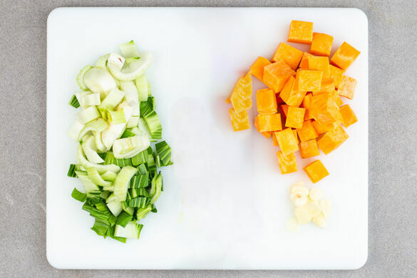Den Pak Choi der Länge nach halbieren und quer in ca. 2cm breite Streifen schneiden. Die Süßkartoffeln schälen und in 1–2cm große Würfel schneiden. Den Knoblauch schälen und in feine Scheibchen schneiden.