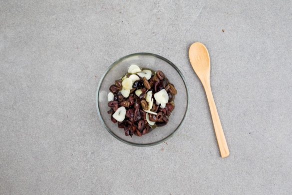 Die Oliven in Ringe schneiden und mit dem Knoblauch und 2TL Olivenöl verrühren.
