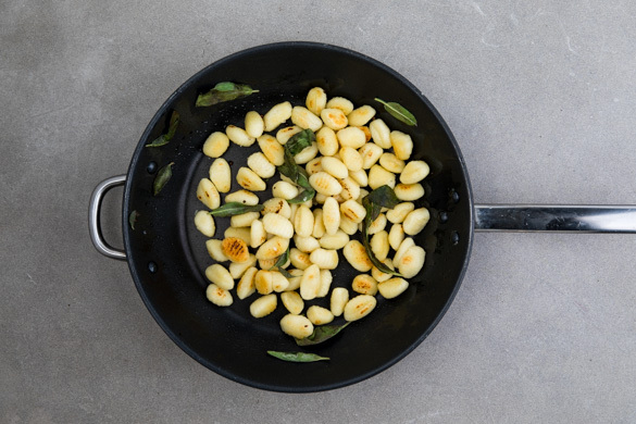 In einer zweiten großen Pfanne die Gnocchi mit 2EL Olivenöl bei mittlerer Hitze 6–8Min. goldgelb anbraten. Währenddessen die Salbeiblätter von den Stängeln zupfen und während der letzten 1–2Min. mitbraten. Die Salbei-Gnocchi mit Salz und Pfeffer würzen.