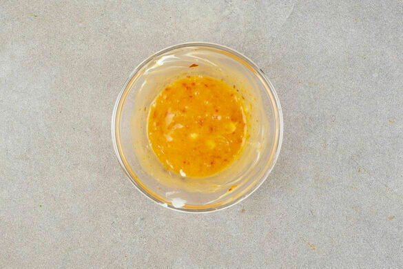 Inzwischen die Sweet-Chili-Sauce mit 4EL Mayonnaise und 1 Prise Salz verrühren.