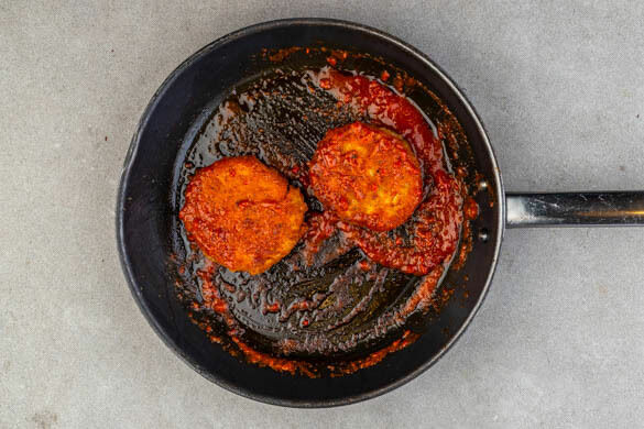 Die Pattys in einer mittelgroßen Pfanne mit 1EL Olivenöl bei mittlerer bis starker Hitze auf jeder Seite 3–5Min. goldbraun braten. Die Brötchen aufschneiden und 3–5Min. auf dem Backrost im Ofen aufbacken. Die Pattys aus der Pfanne nehmen und kurz beiseitestellen. Die Harissa, die Granatapfelmelasse und 1–2EL Wasser einrühren, bis eine glatte Sauce entsteht.