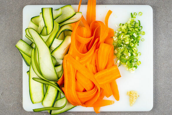Die Karotten ggf. schälen und mit dem Sparschäler rundum in lange, dünne Streifen schneiden. Die Zucchini ebenfalls mit dem Sparschäler rundum in lange, dünne Streifen schneiden. Die Lauchzwiebeln schräg in feine Ringe schneiden. Den Knoblauch schälen und fein würfeln.