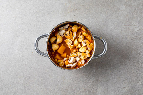 Die Champignons und die Kichererbsen unterrühren und den Eintopf noch ca. 10Min. ohne Deckel bei schwacher bis mittlerer Hitze köcheln lassen, bis der Kürbis gar ist. Bei Bedarf noch etwas mehr Wasser hinzugeben.