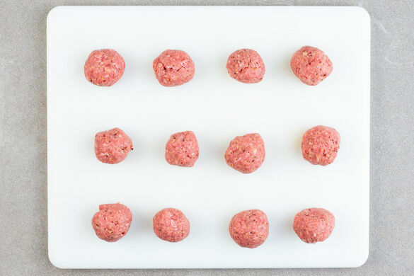 Das Hackfleisch mit 1EL Senf, dem Panko-Paniermehl, 2EL Sahne und je 1 kräftigen Prise Salz und Pfeffer vermengen und alles gut durchkneten. In walnussgroße Bällchen formen.
