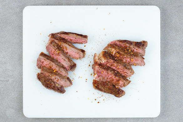 Das Fleisch trocken tupfen und in einer großen Pfanne mit 2EL Olivenöl bei starker Hitze auf jeder Seite 2–3Min. braten, abhängig davon, ob es medium oder eher durchgebraten sein soll. Aus der Pfanne nehmen und bis zum Servieren auf einem Teller abgedeckt ruhen lassen.