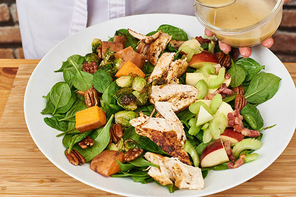 Die amerikanische Küche hat mehr zu bieten als Burger und Hot Dogs, wie dieser leckere und sättigende Salat beweist. Auf zartem Babyspinat werden geröstete Süßkartoffel und Rosenkohl, knusprig gebratener Speck, fein gewürztes Hähnchen sowie knackiger Apfel, Spinat und Sellerie angerichtet. Halte kurz inne und genieße das Kunstwerk, bevor du es mit dem köstlich-cremigen Dressing und Pekannüssen servierst.