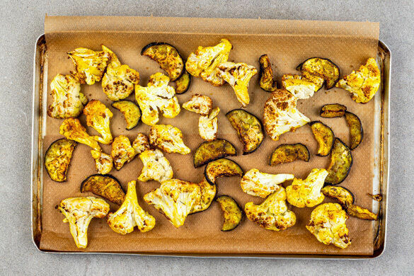 Den Blumenkohl und die Auberginen auf zwei mit Backpapier ausgelegten Backblechen mit insgesamt 2EL Pflanzenöl, ¾ des Currypulvers und ½TL Salz vermengen und gleichmäßig verteilen. Im vorgeheizten Ofen 20–25Min. rösten, bis das Gemüse goldbraun ist. Nach der Hälfte der Zeit wenden und die Position der Bleche tauschen.