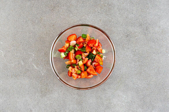 2EL Pflanzenöl, 2EL Essig, 2TL Honig sowie je 1 kräftige Prise Salz und Pfeffer zu einem Dressing verrühren. Die Tomaten in ca. 1cm kleine Würfel schneiden. Die Lauchzwiebeln in feine Ringe schneiden und mit den Tomaten und dem Dressing vermengen.