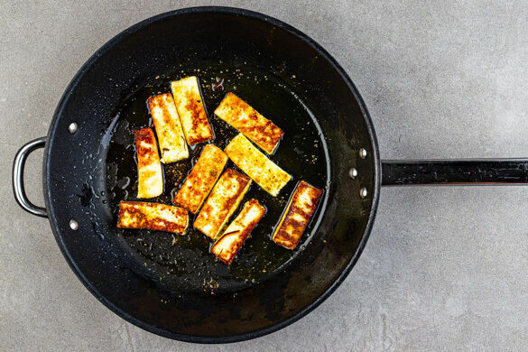 Den Paneer in einer großen Pfanne mit 2EL Pflanzenöl bei mittlerer Hitze 1–2Min. auf jeder Seite goldbraun braten. Mit dem übrigen Currypulver bestreuen, aus der Pfanne nehmen und mit dem Blumenkohl-Auberginen-Gemüse auf Teller verteilen. Die Eier und den Tomatensalat ohne Flüssigkeit darauf anrichten und mit dem Dip beträufelt servieren.