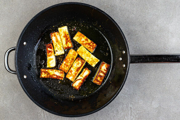 Den Paneer in einer mittelgroßen Pfanne mit 1EL Pflanzenöl bei mittlerer Hitze 1–2Min. auf jeder Seite goldbraun braten. Mit ca. ½TL Currypulver bestreuen, aus der Pfanne nehmen und mit dem Blumenkohl-Auberginen-Gemüse auf Teller verteilen. Die Eier und den Tomatensalat ohne Flüssigkeit darauf anrichten und mit dem Dip beträufelt servieren.