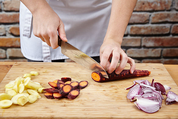 Den Backofen auf 220°C Umluft (240°C Ober-/Unterhitze) vorheizen. Die Zwiebel schälen, halbieren und in Spalten schneiden. Die Karotten schälen und schräg in dünne Scheiben schneiden.