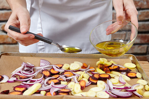 Die Zwiebeln und die Karotten auf einem mit Backpapier ausgelegten Backblech verteilen, mit 2–3EL Olivenöl, Salz, Pfeffer und 1 Prise Zucker vermischen und ca. 10–12Min. im Ofen goldbraun werden lassen. Die Brötchen ca. 5Min. im Ofen mitbacken, herausnehmen und abkühlen lassen.