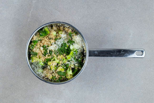 Nach ca. 4Min. den Topf vom Herd nehmen und den Couscous unter den Brokkoli mengen. Den Topf abgedeckt 8–10Min. beiseitestellen und den Couscous quellen lassen.