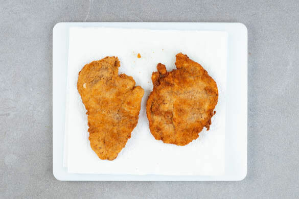 Eine mittelgroße Pfanne mit einer ca. 0,5cm hohen Schicht Pflanzenöl bei starker Hitze erwärmen. Die Schnitzel in das heiße Öl geben und auf jeder Seite 2–3Min. goldbraun anbraten. Die Hitze ggf. reduzieren, falls die Panade zu schnell bräunt. Die Schnitzel auf etwas Küchenkrepp abtropfen lassen und mit 1 Prise Salz würzen.