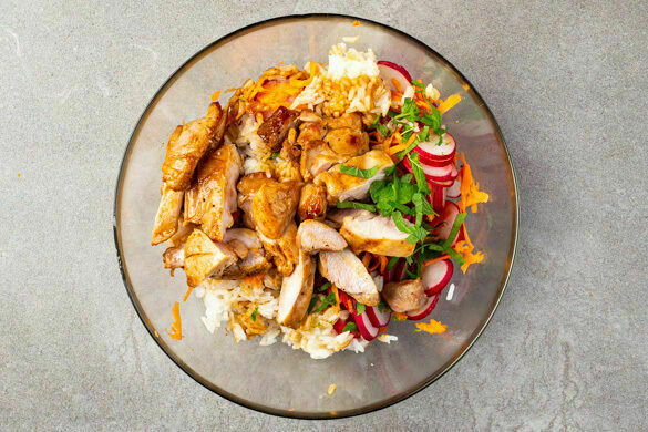 Bitte eintreten in die aufregende Geschmackswelt Südostasiens! Heute servieren wir einen Reissalat, der einfach alle Register zieht: zart gebratenes Hähnchenschenkelfilet und duftiger Jasminreis in einer perfekt balancierten Sauce aus süßen, sauren und pikanten Elementen, für die die Thai-Küche so beliebt ist. Alles vermengt mit knackigen Karotten und Radieschen mit knusprigen Schalotten und Cashews obendrauf – willkommen!