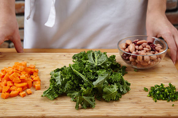 Inzwischen den Kohl und die Bohnen zu der Sauce geben, gut vermischen und kräftig mit Salz und Pfeffer abschmecken. Kurz aufkochen lassen bis der Grünkohl zusammenfällt.