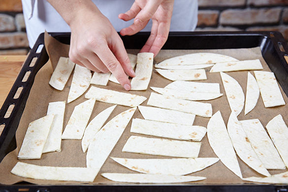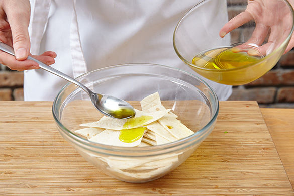 Inzwischen die Tortillas in ca. 2cm dicke Streifen schneiden und in einer großen Schüssel zusammen mit 3EL Olivenöl und einer Prise Salz vermengen.