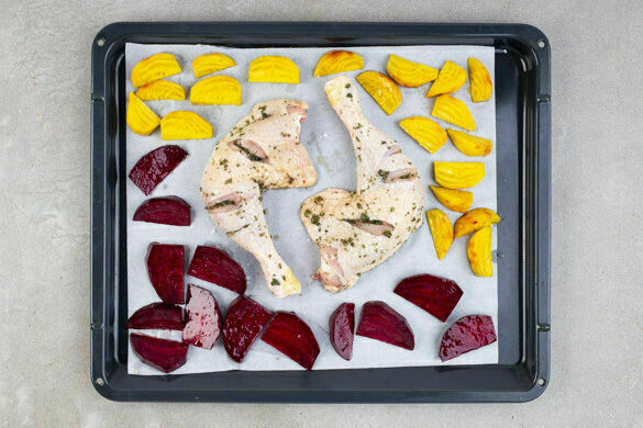 Das Fleisch trocken tupfen, auf der Hautseite einschneiden und mit dem Würzöl einreiben. Auf zwei mit Backpapier ausgelegten Blechen im Ofen ca. 10Min. backen. Die Bete mit 2EL Olivenöl und je 1 Prise Salz und Pfeffer vermengen, mit aufs Blech geben und mit dem Fleisch weitere 15–20Min. garen, ggf. mit Alufolie abdecken. Die Position der Bleche nach der Hälfte der Zeit tauschen.