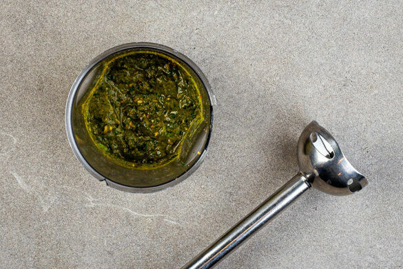Die Thai-Basilikumblätter, die Chiliringe und den Koriander samt Stängeln mit der Misopaste, den Erdnüssen, dem Sesamöl und 4EL Pflanzenöl in einem hohen Gefäß mit einem Stabmixer möglichst cremig pürieren. Falls das Pesto zu dickflüssig ist, 2–3TL Kochwasser hinzufügen. Tipp: Um eine schöne Textur zu erhalten, einige Erdnüsse intakt lassen.