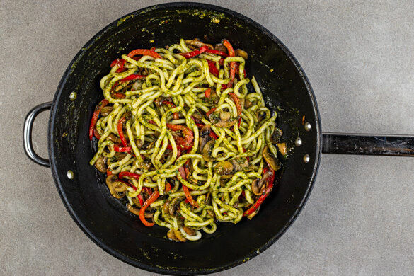 In Japan stehen Udon-Nudeln hoch im Kurs, vor allem in Sachen Comfortfood. Wann der Hype begann, ist ungeklärt, wo er aber hinführt, ist klar wie Kloßbrühe: Auf deinen Teller! Wenn du die elastischen Weizenmehlnudeln mit knackiger Paprika, Champignons und weichgekochtem Ei in einem aromatischen Pesto aus frischem Koriander und Thai-Basilikum, Miso, Peperoni und Erdnüssen servierst, macht der Wirbel um die Nudel wirklich Sinn!