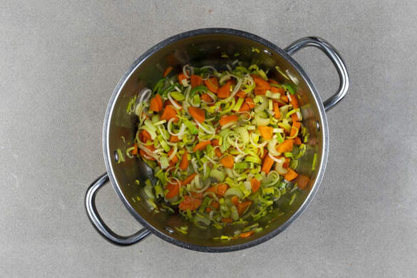 Die Dillstängel, den Lauch, den Sellerie und die Karotten in einem großen Topf mit 2EL Pflanzenöl bei mittlerer bis starker Hitze 5–6Min. braten, bis der Lauch weich ist. Gelegentlich umrühren.