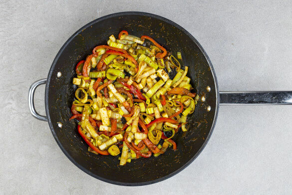 Die Paprika und den Lauch in einer großen Pfanne mit 2EL Pflanzenöl und 1 Prise Salz bei mittlerer Hitze 2–3Min. anbraten. Dann die Currypaste unterrühren und ca. 2Min. mitbraten.