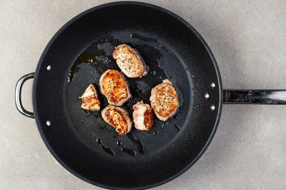 Das Fleisch mit etwas Küchenkrepp trocken tupfen, ggf. von Sehnen befreien und in 6–8 Medaillons schneiden. Von beiden Seiten mit je 1 Prise Salz und Pfeffer würzen und in einer mittelgroßen, ofenfesten Pfanne mit 1EL Olivenöl bei starker Hitze auf jeder Seite 1–2Min. scharf anbraten.