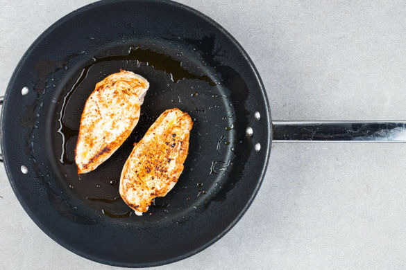 Das Fleisch trocken tupfen, horizontal halbieren und mit je 1 Prise Harissa und Salz von beiden Seiten würzen. In einer großen Pfanne mit 1EL Olivenöl bei mittlerer Hitze auf jeder Seite ca. 2Min. anbraten. Die Pfanne vom Herd nehmen und das Fleisch in der Pfanne ruhen lassen.