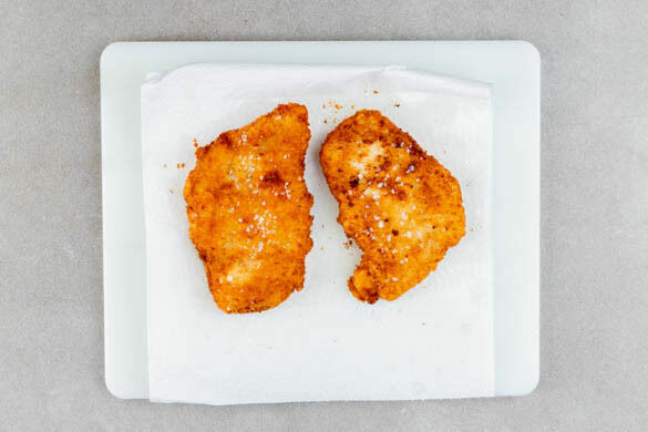 Die Schnitzel in einer mittelgroßen Pfanne mit 4EL Pflanzenöl bei mittlerer bis starker Hitze auf jeder Seite 2–3Min. goldbraun braten. Falls die Panade zu schnell bräunt, die Hitze etwas reduzieren. Auf Küchenkrepp abtropfen lassen und mit Salz würzen.