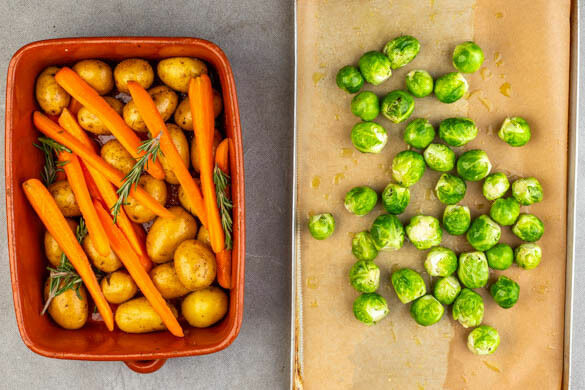 Den Backofen auf 230°C (210°C Umluft) vorheizen. Die Karotte schälen, längs vierteln und in einer mittelgroßen Auflaufform mit den Kartoffeln, dem Rosmarin sowie 1EL Olivenöl und ½TL Salz vermengen. Den Rosenkohl auf einem mit Backpapier ausgelegten Backblech mit 1EL Olivenöl sowie je 1 kräftigen Prise Salz und Pfeffer vermengen und gleichmäßig verteilen.