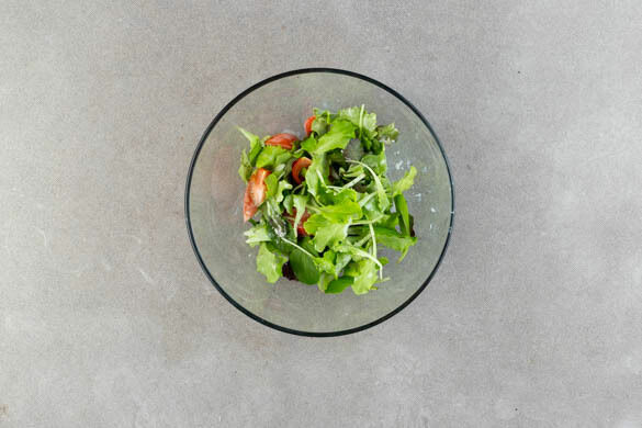 Die Tomaten in Spalten schneiden. 1TL Mayonnaise und 1TL hellen Essig mit je 1 Prise Salz und Pfeffer zu einem Dressing verrühren.
