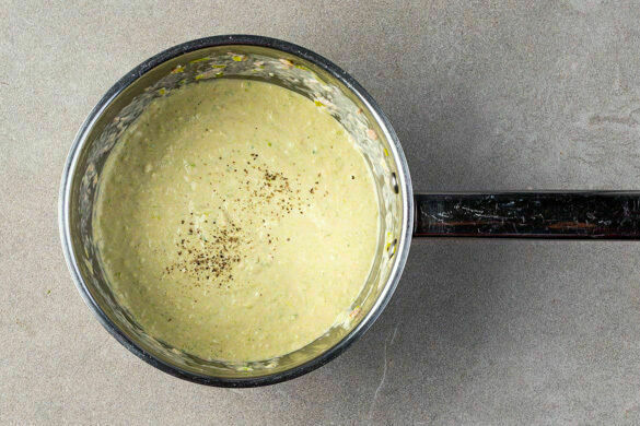 Die Lauchstreifen in einem kleinen Topf mit 2EL Olivenöl bei mittlerer Hitze ca. 2Min. anschwitzen. Den Thunfisch, den Knoblauch und 4EL Wasser unterrühren und 2–3Min. mitköcheln. Wenn der Lauch weich ist, die Crème fraîche unterrühren und alles mit einem Stabmixer pürieren. Mit der Limettenschale, dem Limettensaft sowie Salz und Pfeffer abschmecken.