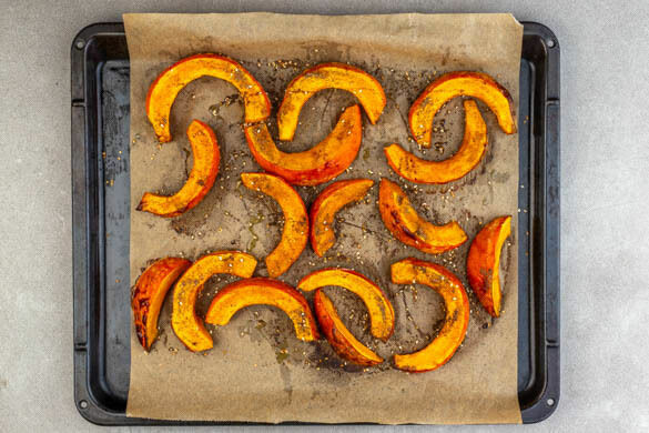 Die Kürbisspalten auf ein mit Backpapier ausgelegtes Backblech legen, mit 1EL Olivenöl und je 1 kräftigen Prise Salz und Pfeffer würzen und ca. 20Min. im Ofen rösten. Dann wenden und die Kürbisspalten mit der Gewürzmischung bestreuen und mit ½EL Olivenöl beträufeln. Die Kürbisspalten weitere 5–10Min. im Ofen rösten, bis sie goldgelb und gar sind.