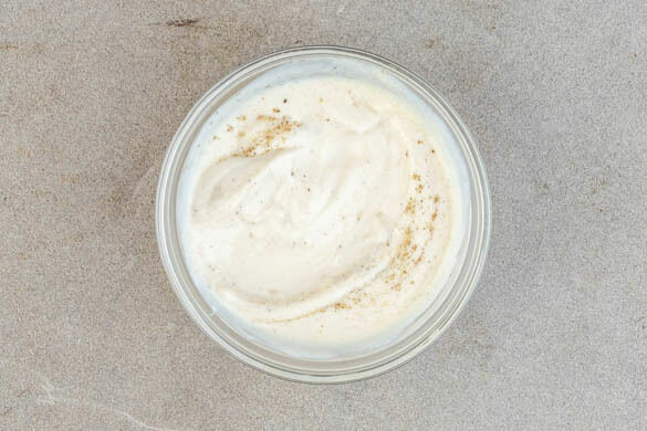 Den Knoblauch schälen und sehr fein würfeln oder durch eine Knoblauchpresse drücken. Den Joghurt mit dem Knoblauch verrühren und mit Salz und Pfeffer abschmecken.
