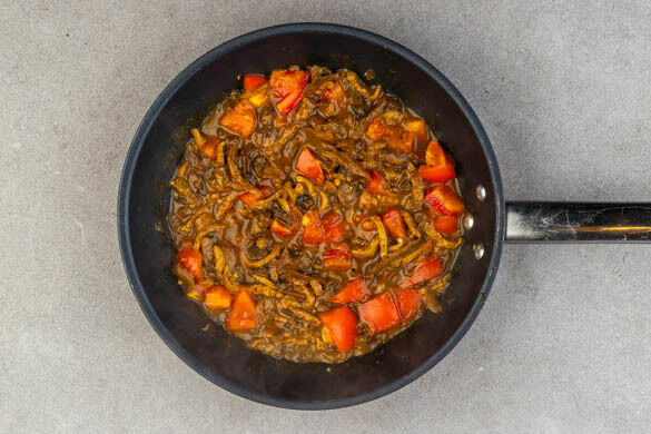 Die Tomate grob würfeln und mit den Pilzen und 2EL Wasser in einer kleinen Pfanne bei mittlerer bis starker Hitze 3–5Min. köcheln lassen, dabei gelegentlich umrühren.