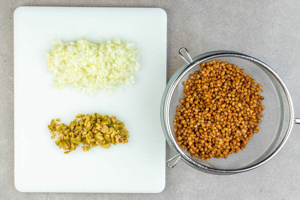 Die Zwiebeln schälen, halbieren und fein würfeln. Die Oliven grob schneiden. Die Linsen in einem Sieb mit kaltem Wasser abspülen und abtropfen lassen.