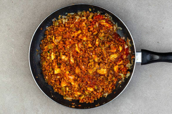Die Zwiebeln in einer großen Pfanne mit 2EL Olivenöl bei mittlerer Hitze 2–3Min. glasig anbraten. Die Oliven, die Linsen und die Gewürzmischung hinzugeben, die passierten Tomaten und das Zucchinifruchtfleisch einrühren und bei niedriger Hitze abgedeckt ca. 10Min. köcheln lassen. Den Deckel abnehmen und ca. 5Min. weiterköcheln. Mit Salz und Pfeffer abschmecken.