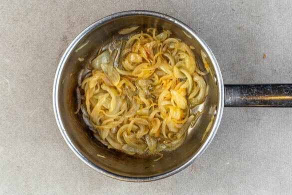 Den Backofen mit Grillfunktion oder Ober-/Unterhitze auf 250°C vorheizen. Die Zwiebeln schälen, halbieren und in dünne Streifen schneiden. 2EL Butter in einem mittelgroßen Topf bei niedriger bis mittlerer Hitze schmelzen. Die Zwiebeln und ½TL Salz hinzugeben und 10–15Min. braten, bis die Zwiebeln beginnen, glasig zu werden.