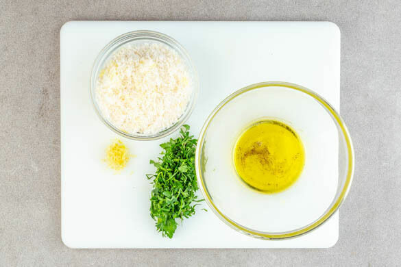 Den Käse fein reiben. Die Zitronenschale abreiben, dann die Zitrone halbieren und eine Hälfte auspressen. Die ½ des Käses und die Zitronenschale mit dem Paniermehl vermengen. 2EL Olivenöl, 1EL Zitronensaft und je 1 kräftige Prise Salz und Pfeffer zu einem Dressing verrühren. Die Petersilie samt Stängeln fein hacken.