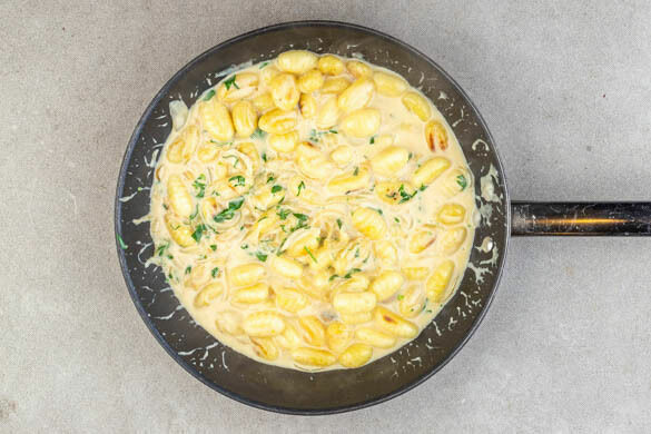Die Gnocchi in einer großen Pfanne mit 2EL Olivenöl bei mittlerer Hitze 4–6Min. anbraten, bis sie anfangen, appetitlich zu bräunen. Die Sauce und die ½ der Petersilie hinzugeben, aufkochen lassen und mit Salz und Pfeffer abschmecken.