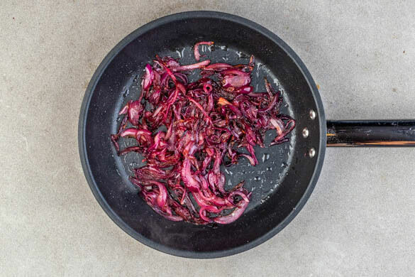 Die Zwiebeln schälen, halbieren, in feine Streifen schneiden und in einer mittelgroßen Pfanne mit 2EL Olivenöl und ½TL Salz bei niedriger bis mittlerer Hitze ca. 10Min. unter häufigem Rühren goldbraun braten. Ggf. esslöffelweise Wasser hinzugeben, damit die Zwiebeln nicht nicht zu trocken werden.